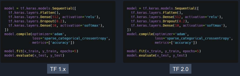 ์ผ์ชฝ์ tesorflow 1.x์ ์์ค์ด๊ณ , ์ค๋ฅธ์ชฝ์ tensorflow 2.0์ ์์ค ์